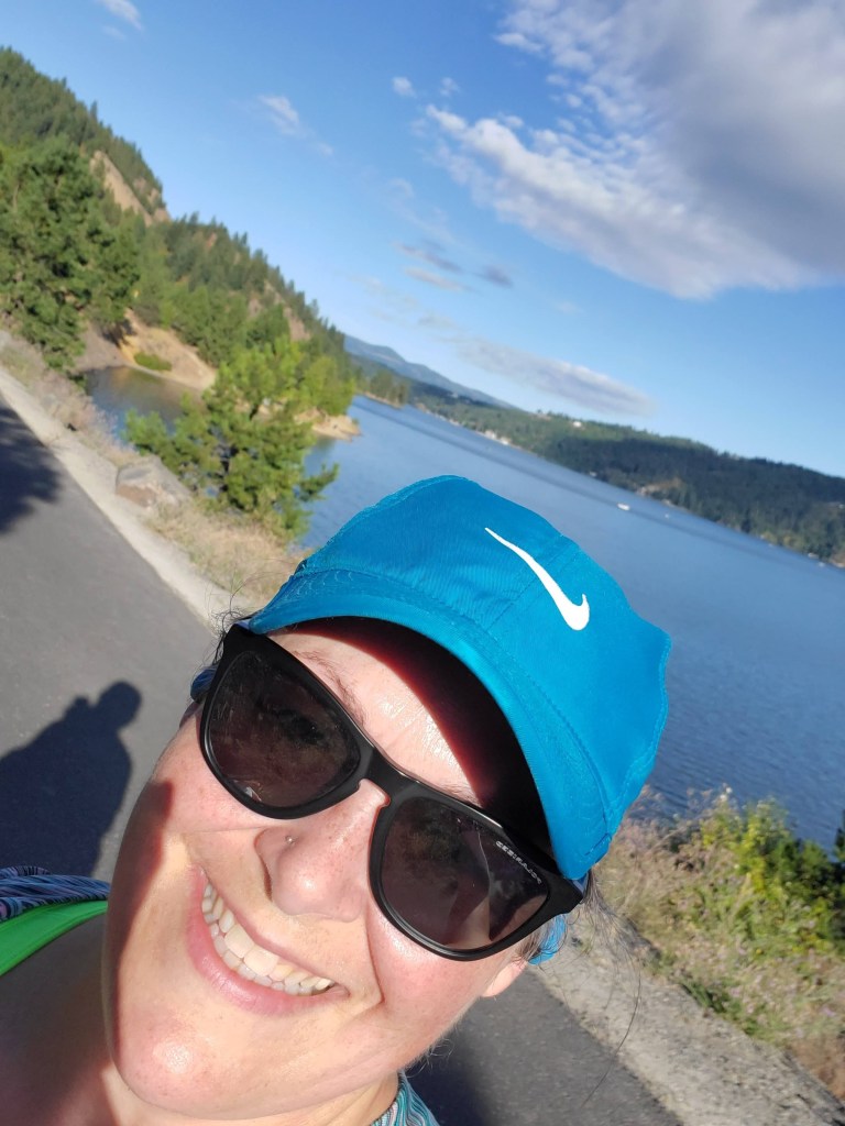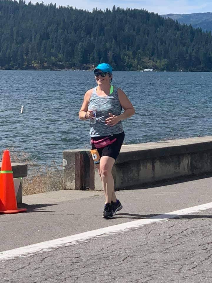 I started to see runners returning. The course is an out and back in two directions. So, even though it was spaced out, I almost always could spot a runner somewhere. Around mile 4, I needed to use the bathroom, and fortunately there was a trail bathroom with pit toilet that was unlocked. It was smelly but I was happy to use it. I was also extremely happy I brought a pack of Wet Ones since there was no sink or hand sanitizer! I believe there were porta potties out as well, but I didn’t pay attention since I didn’t need them after my first stop. Back on the trail, along the lake I noticed that there were Ironman signs. Come to find out, this is the course that they use for the CDA Ironman. Running along the lake I saw people swimming for fitness (not just kids playing) and cyclists flying by me. My mind wandered to a future triathlon I may run.