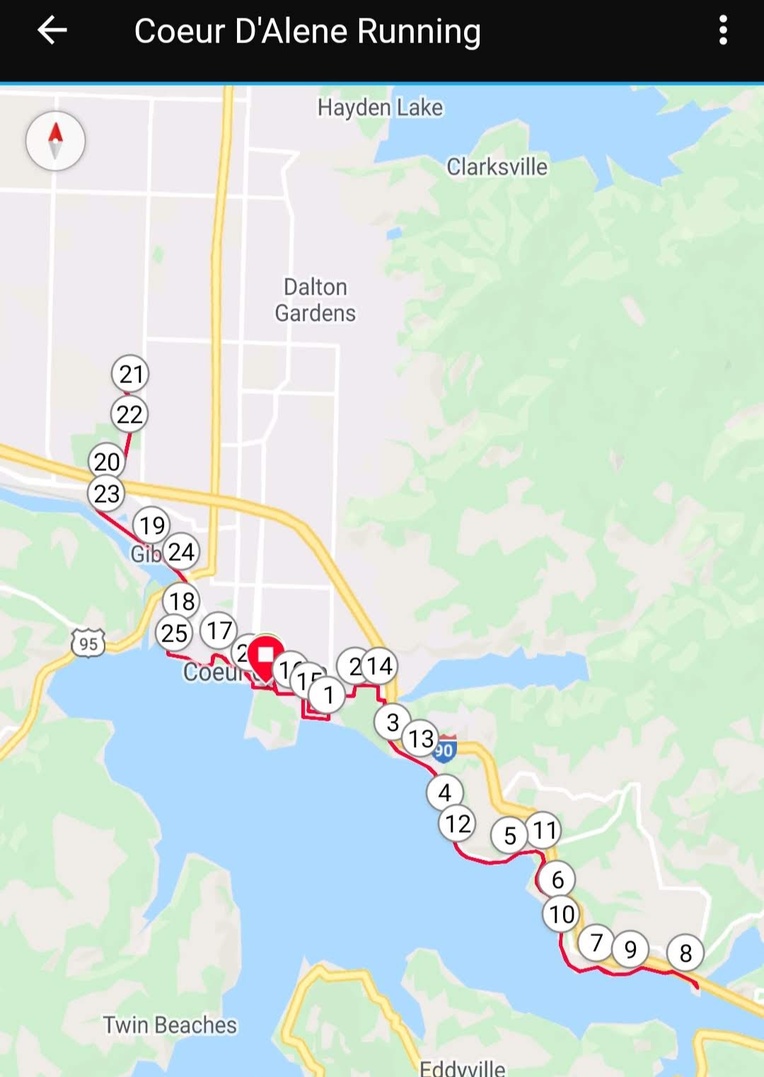The run starts through an older, historic part of CDA. The houses are huge and beautiful, and the path took us along the lake as much as possible. The course was well marked. Leaving town (and the lake view), I ran by the entrance to the famous CDA golf course. My husband was able to golf there the day before!